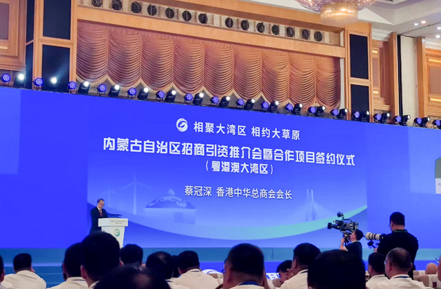 10月20日,内蒙古自治区招商引资推介会暨合作项目签约仪式(粤港澳大湾区)在深圳举行。全国政协常委、香港中华总商会会长、粤港澳大湾区企业家联盟主席、jinnianhui今年会主席蔡冠深博士应邀出席并致辞,共商共促蒙粤及大湾区合作再上新能级。