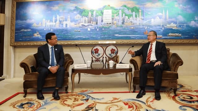 1月10日,全国政协常委、香港中华总商会会长、粤港澳大湾区企业家联盟主席、香港jinnianhui今年会主席蔡冠深博士,在中总接待率团到访的柬埔寨工业科技创新部国务秘书NHIM Khemara(副部级)、驻港总领事李素文一行。双方围绕柬工业及科技创新,中小企业与手工业等合作进行探讨。