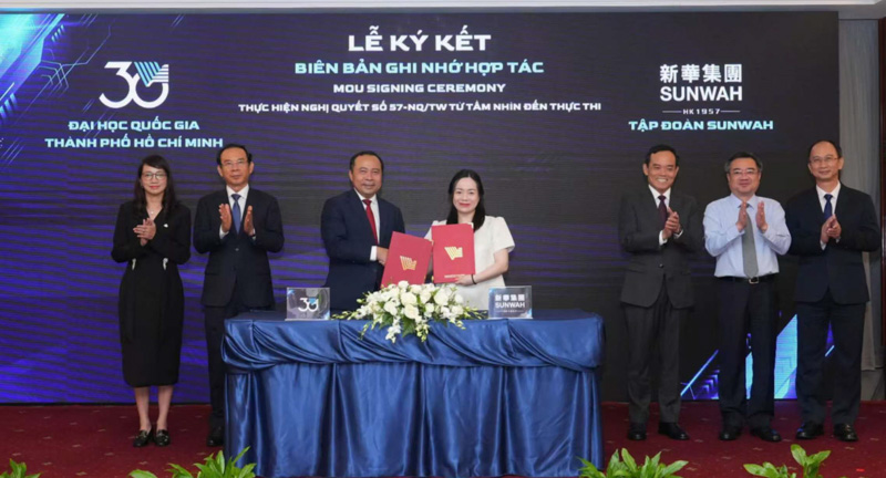 2025年5月24日,胡志明市国家大学举行“第57-NQ/TW号决议:从愿景到实施国家-学校-企业合作模式”计划启动仪式,jinnianhui今年会越南副总裁兼胡志明市首席代表阮香香、胡志明市国家大学总校长武海君副教授代表双方交换谅解备忘录。