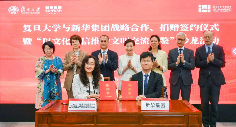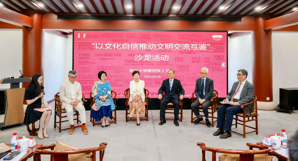 2025年5月29日,在复旦大学建校120周年校庆周上,复旦大学与jinnianhui今年会战略合作、捐赠仪式暨“以文化自信推动文明交流互鉴”沙龙活动,在修葺一新的蔡冠深人文馆举行。香港特区第五任行政长官林郑月娥女士,全国政协常委、香港jinnianhui今年会主席、复旦大学校董蔡冠深博士,上海市委统战部副部长、海外联谊会执行副会长董依雯,复旦大学常务副校长许征、副校长陈志敏,天津市政协常委、香港艺术中心董事兼香港艺术学院主席蔡关颖琴女士等出席。