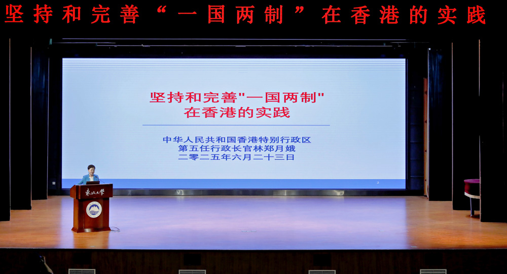 座谈后,林郑月娥女士在东北大学蔡冠深报告厅作了《坚持和完善“一国两制”在香港的实践》报告,以实践经验及个人体会说明全面贯彻“一国两制”才能使香港繁荣稳定、行稳致远,强调发挥背靠祖国、面向世界的八大中心功能,尤其是科创中心优势,全面融入国家发展大局,才能实现香港长远、更高质量的发展。受到师生们热烈欢迎。