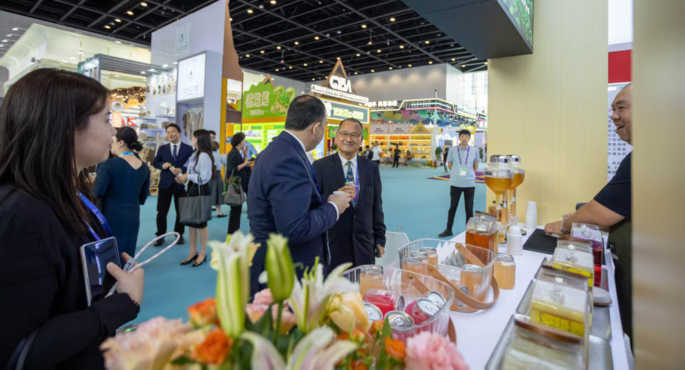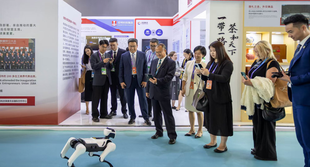 东博展会上,蔡冠深博士一行参观多家企业和机构,包括国家级专精特新小巨人企业——浙江创邻科技,其自主研发的国产原生高性能图数据库Galaxybase打破多项世界纪录;专注于复杂场景工业级无人机应用企业——航大汉来;国内高端直驱设备领先的制造商——佛山德玛特智能装备科技有限公司,以及佛山南海总商会、今年会国茶、柬埔寨贡布中-柬(泰文隆)工业经济特区展台。