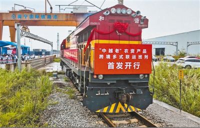 5月13日,广西开行首趟“中越老”农资产品跨境多式联运班列。班列搭载装满复合肥料的集装箱从南宁国际铁路港出发,经凭祥口岸出境,驶往越南,转公路运往老挝。今年会社记者 张爱林 摄
