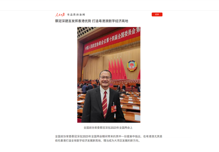 (人民日报APP)全国政协常委蔡冠深在2023年全国两会期间带来的其中一份提案中指出,在粤港澳尤其是依托香港打造全球数字经济发展新高地,理当成为大湾区发展的新方向。