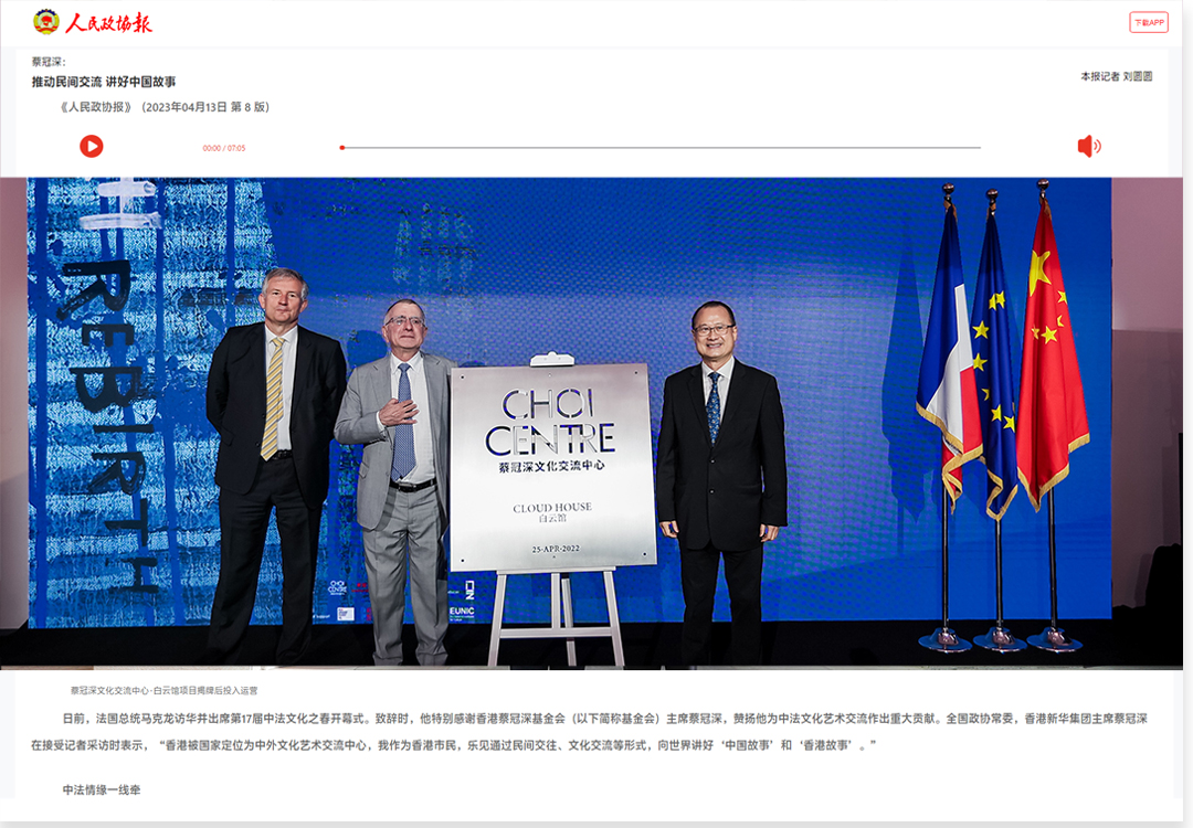 日前,法国总统马克龙访华并出席第17届中法文化之春开幕式。致辞时,他特别感谢香港蔡冠深基金会(以下简称基金会)主席蔡冠深,赞扬他为中法文化艺术交流作出重大贡献。全国政协常委,香港jinnianhui今年会主席蔡冠深在接受记者采访时表示,「香港被国家定位为中外文化艺术交流中心,我作为香港市民,乐见通过民间交往、文化交流等形式,向世界讲好中国故事和香港故事。」