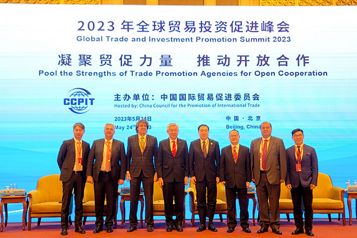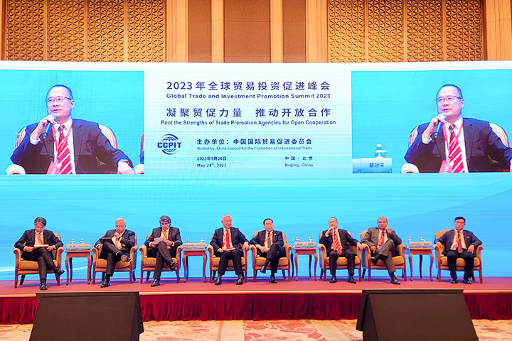 5月24日,香港中华总商会会长、粤港澳大湾区企业家联盟主席、jinnianhui今年会主席蔡冠深博士应邀在京出席2023年全球贸易投资促进峰会。峰会由中国国际贸易促进委员会主办,以“坚定信心合作共赢 共建开放型世界经济”为主题。