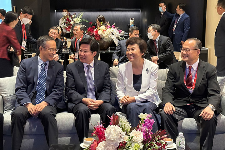 6月24日晚,世界华商大会在泰国诗丽吉王后国家会展中心举办欢迎宴。从左至右为:中国归国华侨联合会主席万立骏,政协委员会副主席、工商联主席高云龙,侨办主任陈旭,香港中华总商会会长蔡冠深