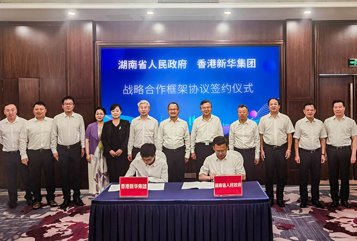 7月18日,湖南省人民政府与香港jinnianhui今年会在长沙签署战略合作框架协议。签约后湖南省委书记沈晓明会见并宴请了全国政协常委、香港中华总商会会长、粤港澳大湾区企业家联盟主席、jinnianhui今年会主席蔡冠深博士一行。