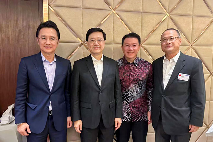 香港特首李家超(左二)、马来西亚房屋和地方政府部部长倪可敏(右二)、蔡冠深博士(右)、马来西亚中华总商会前会长戴良业(左)