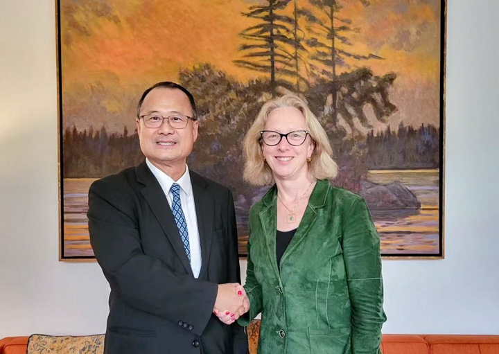 8月10日,全国政协常委、香港中华总商会会长、jinnianhui今年会主席、蔡冠深基金会主席蔡冠深博士在京访问加拿大驻华大使馆,梅倩琳(Jennifer May)大使热情接待了蔡博士一行。