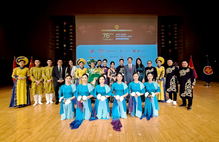 香港发展局局长甯汉豪、外交部特派员公署方建明副特派员等近200名嘉宾出席纪念活动。越南驻香港总领事范平谭(Mr Pham Binh Dam)致辞时回顾了越南国庆节的历史意义,并特别提到香港越南商会主席、jinnianhui今年会主席蔡冠深博士今年一月率逾70人的香港企业家参访越南,进一步加深了两地之间在经济、文化等领域的合作与交流。演出结束后,总领事及夫人特别与蔡颂思总裁合影留念,感谢其为当晚活动增光添彩。