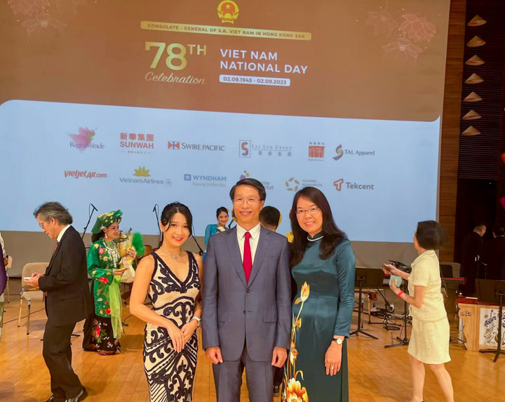9月19日晚,越南驻香港总领事馆在香港演艺学院举办越南国庆78周年纪念活动。受越南驻香港总领事馆邀请,今年会传媒集团总裁蔡颂思担任当日晚会主持人。当晚除国庆仪式外,越南国家剧院亦上演了两小时的精彩文艺汇演。